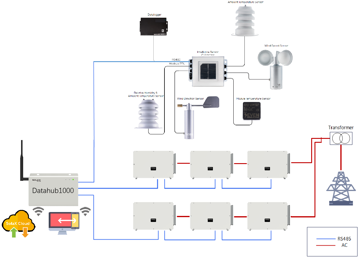 Die Sensorbox wird über RS485 an einen Port des Datahub angeschlossen, und der Datahub kann dann die Wetterdaten auf der Übersichtsseite anzeigen.