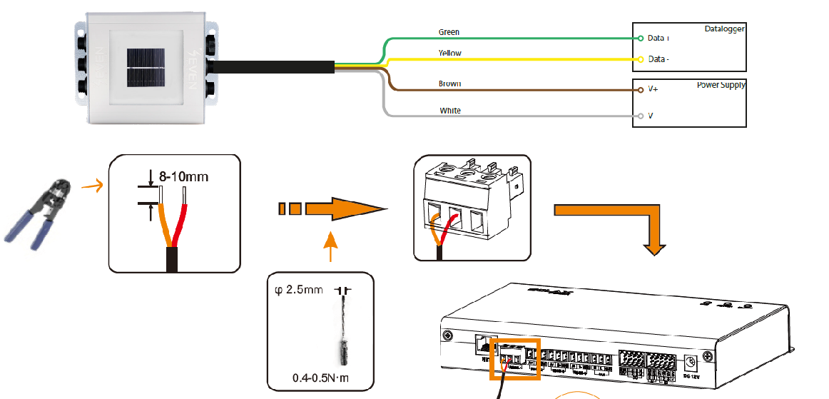 - Am SEVENSENSOR 3S- IS- 5 ist PIN Nummer 6 der Anschluss für die RS485-Verbindung, auch für die Stromversorgung der Sensorbox, grüne und gelbe Kabel sind für RS485, braune und weiße Kabel sind für die Stromversorgung.