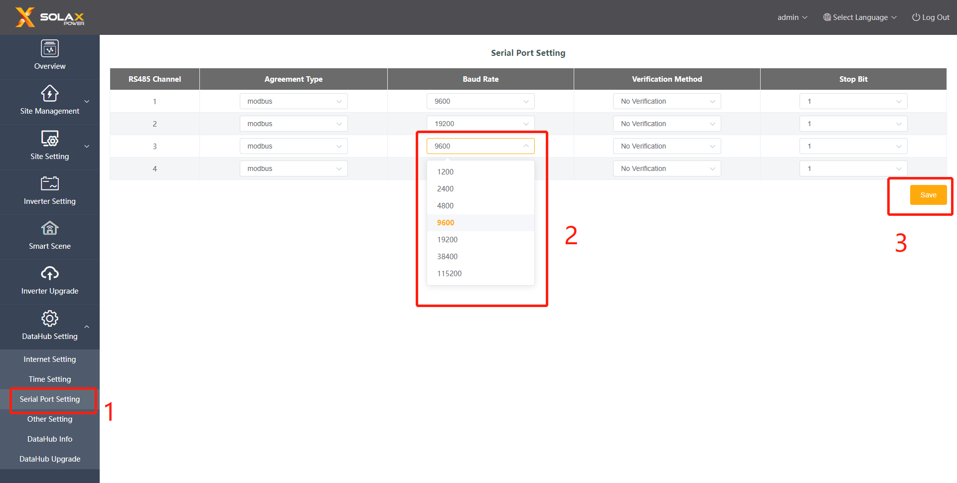 - Suchen Sie im Web-Menü von datahub nach datahub setting- serial port setting