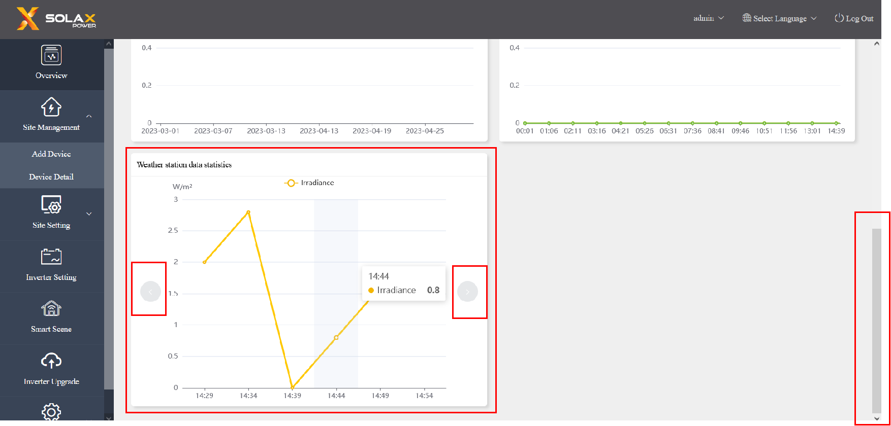 7.Wählen Sie schließlich in der Übersicht die Bildlaufleiste auf der rechten Seite, und das Diagramm in der unteren linken Ecke zeigt die Daten der Umweltüberwachung an. Klicken Sie auf"<" oder">", um die Diagramme der verschiedenen Parameter zu wechseln