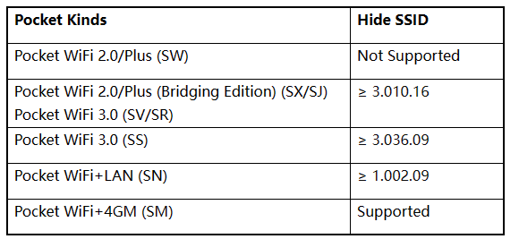 Come abilitare: Impostazione remota APP - Impostazioni di rete - Trasmissione SSID WiFi tascabile. Dopo averlo spento, il segnale WiFi del Pocket verrà visualizzato come una rete nascosta, è necessario inserire manualmente l'SSID durante la connessione.