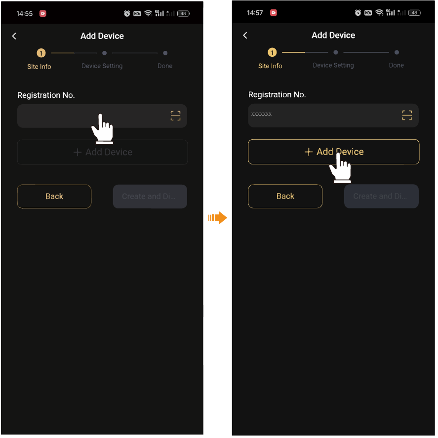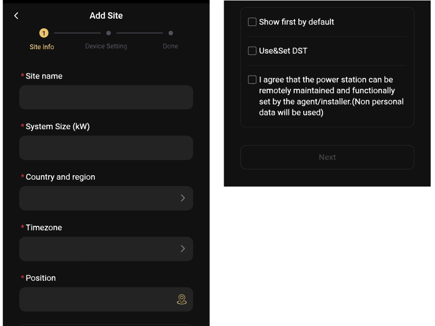 Passaggio 2: consenti a SolaxCloud di accedere alla posizione del tuo sistema, inserisci il nome del sito (autodefinito), le dimensioni del sistema (si riferisce alla potenza fotovoltaica totale del sistema) e aggiungi il dispositivo scansionando il codice su Pocket WiFi.