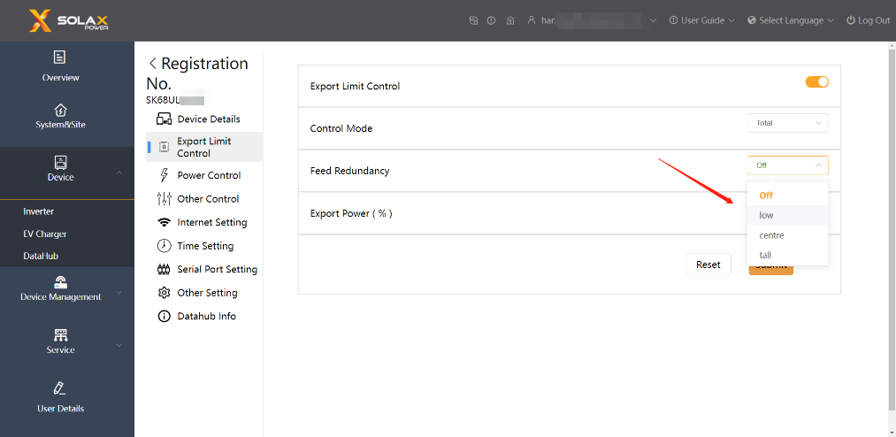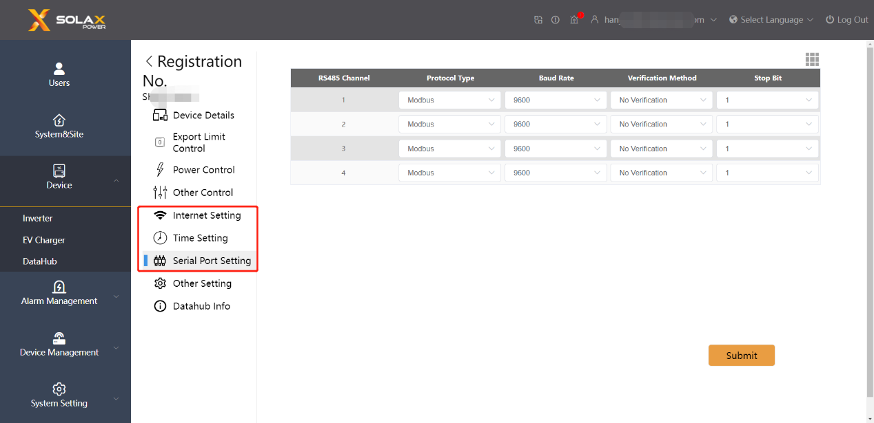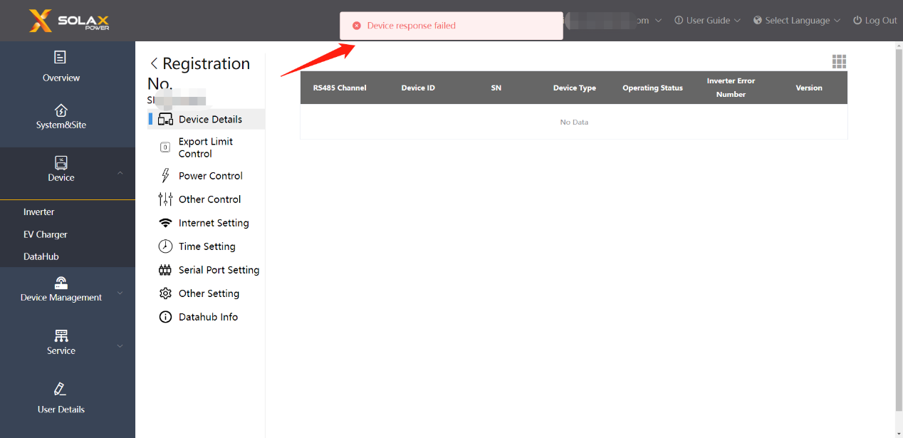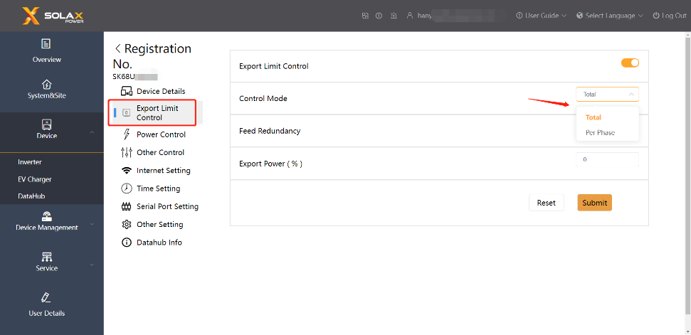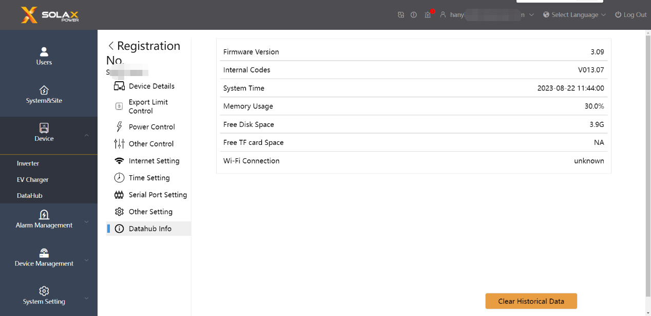 È possibile confermare il codice interno di DataHub da SolaX Cloud: