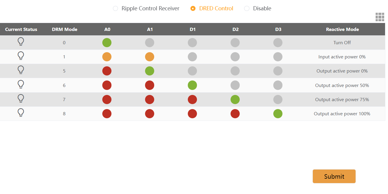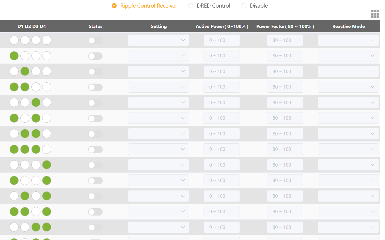 Le voci di impostazione includono: controllo della potenza attiva dell'uscita dell'inverter, controllo della potenza attiva dell'ingresso dell'inverter, controllo della potenza reattiva dell'uscita dell'inverter e spegnimento dell'inverter.