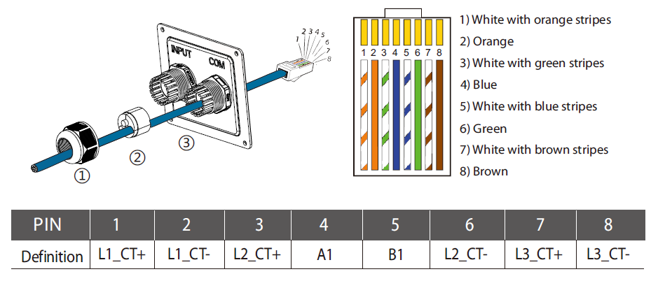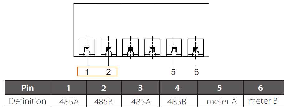 2) Per X3-PRO G2, collegare i due fili (Blu e Bianco con strisce blu) all'altra estremità del cavo di comunicazione ai PIN 1 e 2 della porta "RS485" dell'inverter. Collegare lo strumento ai PIN 5 e 6 della porta "RS485" dell'inverter.