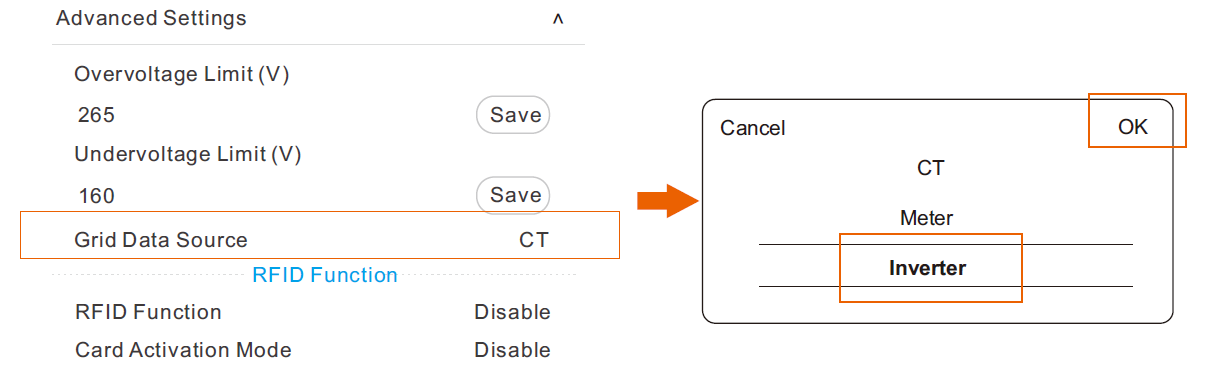 2) Selezionare "Impostazioni avanzate" e impostare la "Sorgente dati di rete" come mostrato di seguito e toccare "OK" per confermare. Il cicalino dell'EV-Charger emetterà un segnale acustico dopo che l'impostazione è stata completata.