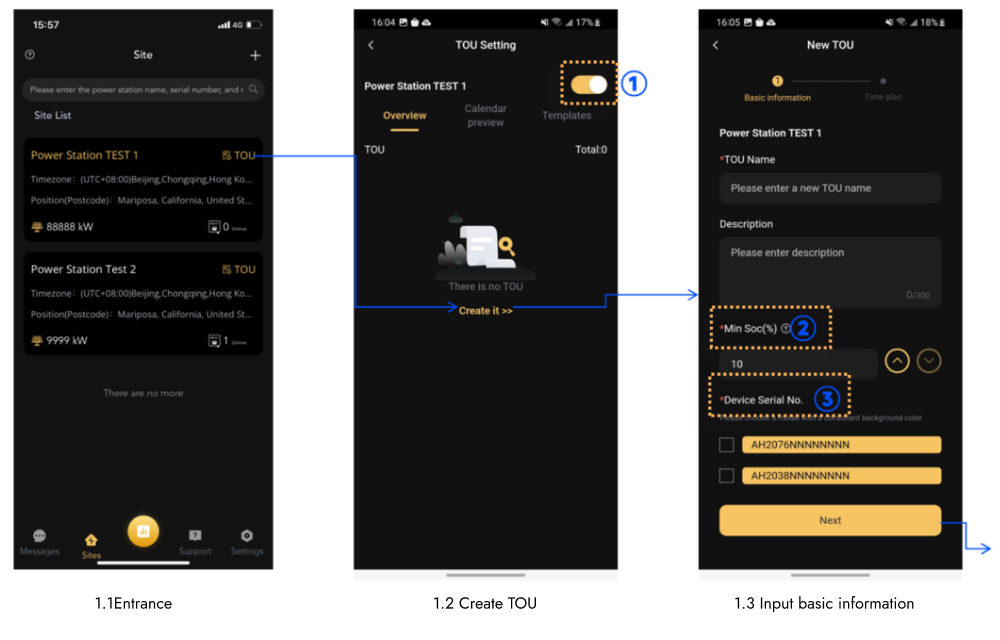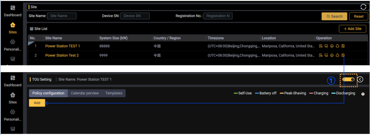 (1) Opzione per aprire o disattivare la modalità TOU nel sito corrente
