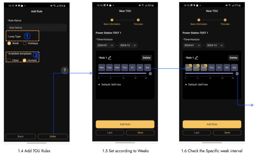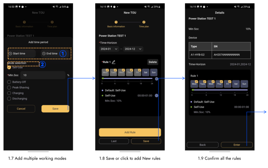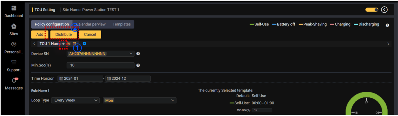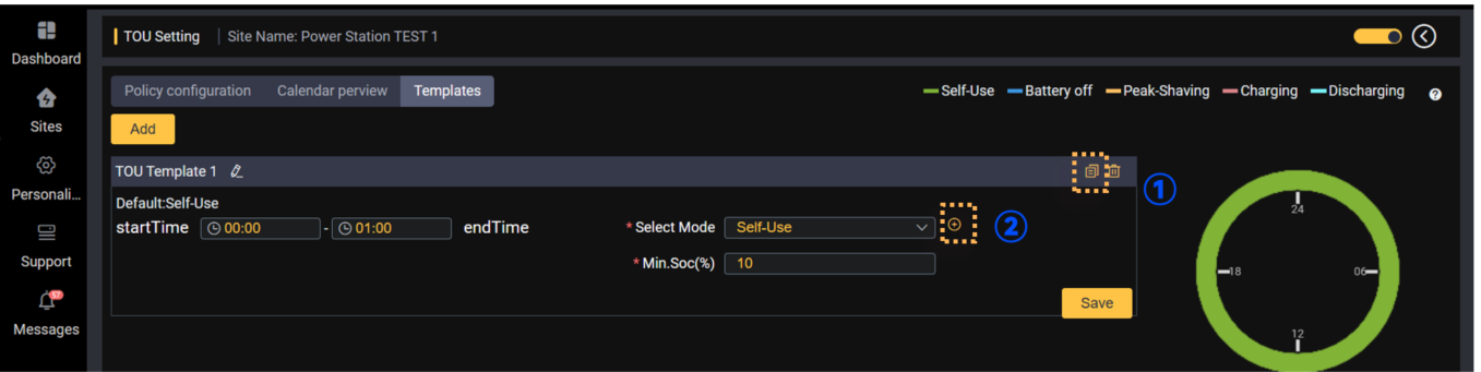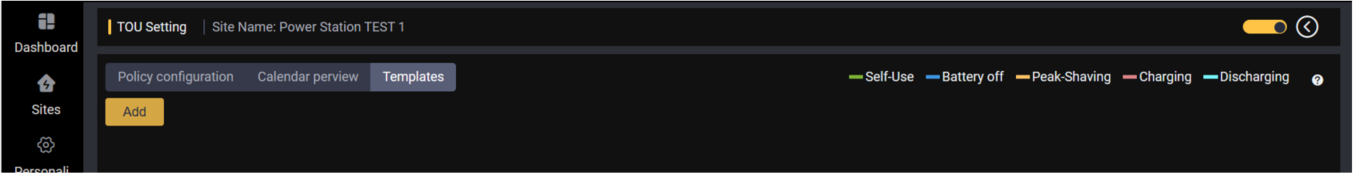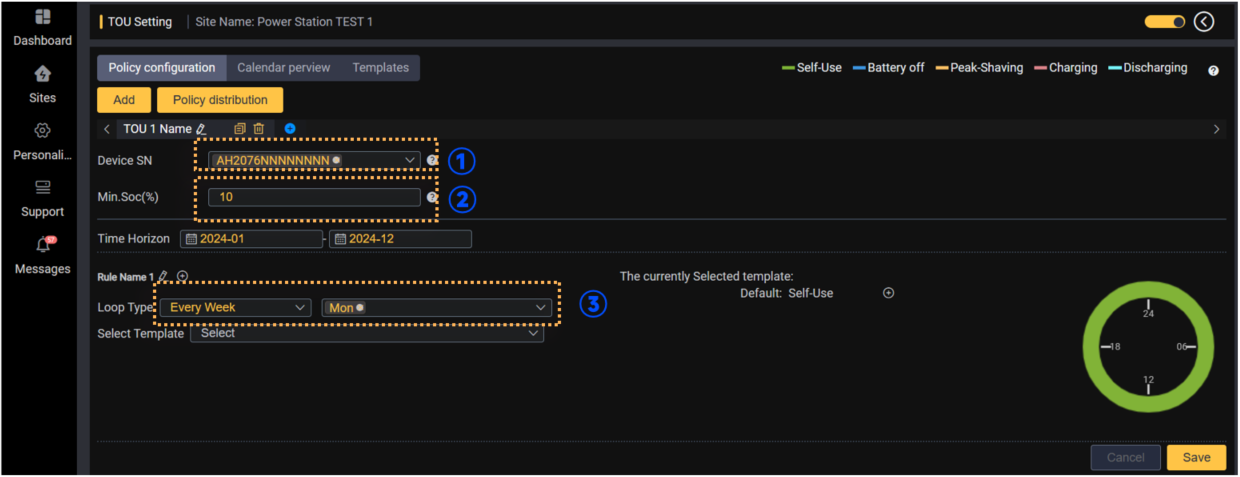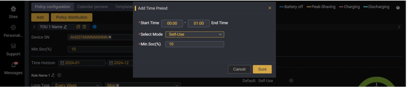 TOU è l'abbreviazione di "TIME OF USE". La funzione TOU è stata aggiunta per aiutare meglio gli utenti a ottimizzare le risorse delle centrali elettriche domestiche per diversi scenari. Questa funzione aiuta gli utenti a impostare la strategia operativa del sito nei fine settimana, nei giorni feriali, nei giorni festivi, ecc. in base alle normative della rete locale, in modo da ottenere una migliore ottimizzazione delle risorse con la premessa di rispettare le normative della società elettrica.