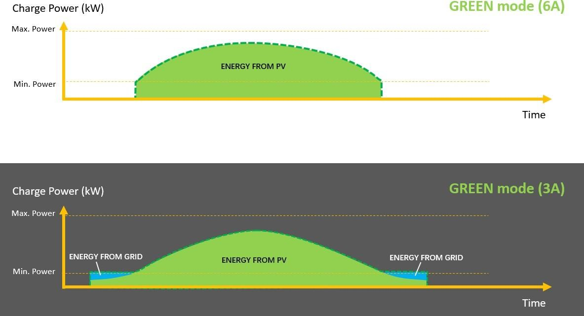 In modalità verde: il livello predefinito è 6 A, in cui il caricabatterie per veicoli elettrici inizierà a caricarsi solo se la corrente generata raggiunge i 6 A e non prenderà mai elettricità dalla rete. Mentre c'è un altro livello di 3A inizia a caricarsi se la corrente di generazione raggiunge i 3A, in grado di acquistarne altri fino a 3A dalla rete. Questa modalità di lavoro impiegherà tutti i suoi sforzi per aiutare i clienti a utilizzare l'energia rinnovabile e ridurre i costi di acquisto dell'elettricità dalla rete.
