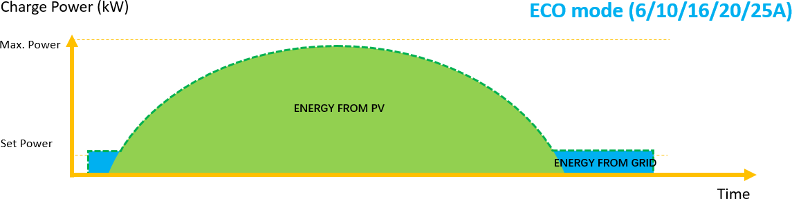 In modalità Eco: aiuta gli utenti a caricare a una velocità di potenza minima (impostata dall'utente). Se c'è un surplus di energia dal fotovoltaico, può superare la potenza minima per sfruttare appieno l'energia. Se l'energia fotovoltaica non è sufficiente, l'elettricità dalla rete verrà caricata alla potenza minima. Ad esempio, gli utenti impostano la corrente di carica 16A. Se la corrente dell'inverter è di soli 10 A, il resto verrebbe prelevato dalla rete come 6 A. Se la corrente dell'inverter (FV) è di 18 A, lo Smart EV Charger emetterà 18 A.