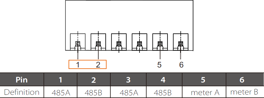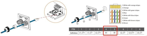 Come mostrato nello schema, i pin4/5 (RS485) vengono utilizzati per comunicare con gli inverter. Si prega di notare che i pin 1/2/3/6/7/8 vengono utilizzati per collegare i TA nel sistema autonomo. Non è necessario utilizzarli se è presente una connessione tra il caricabatterie per veicoli elettrici e l'inverter.