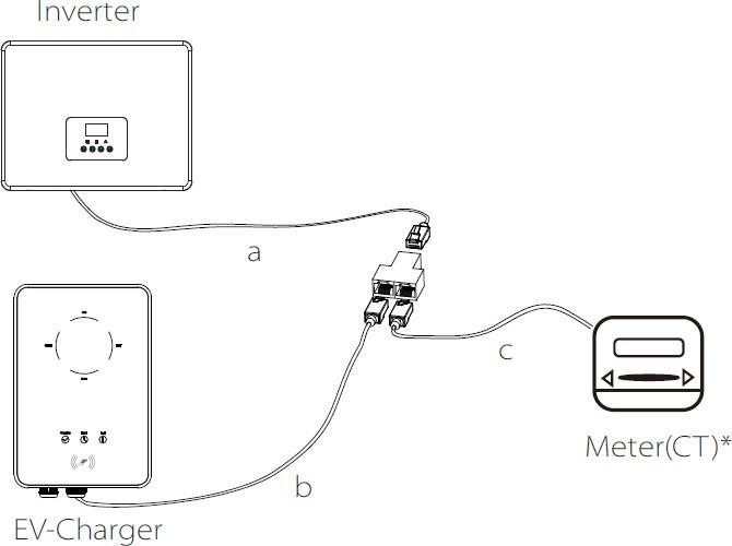 La porta COM condivide la stessa porta RJ45 con Meter, quindi è necessario uno splitter per collegare il caricabatterie EV e il contatore all'inverter come mostrato nel diagramma seguente. Si prega di non posizionare lo splitter in un luogo impermeabile.
