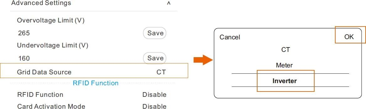 Selezionare "Impostazioni avanzate" e impostare la "Sorgente dati di rete" come mostrato di seguito e toccare "OK" per confermare. Il cicalino dell'EV-Charger emetterà un segnale acustico dopo che l'impostazione è stata completata.
